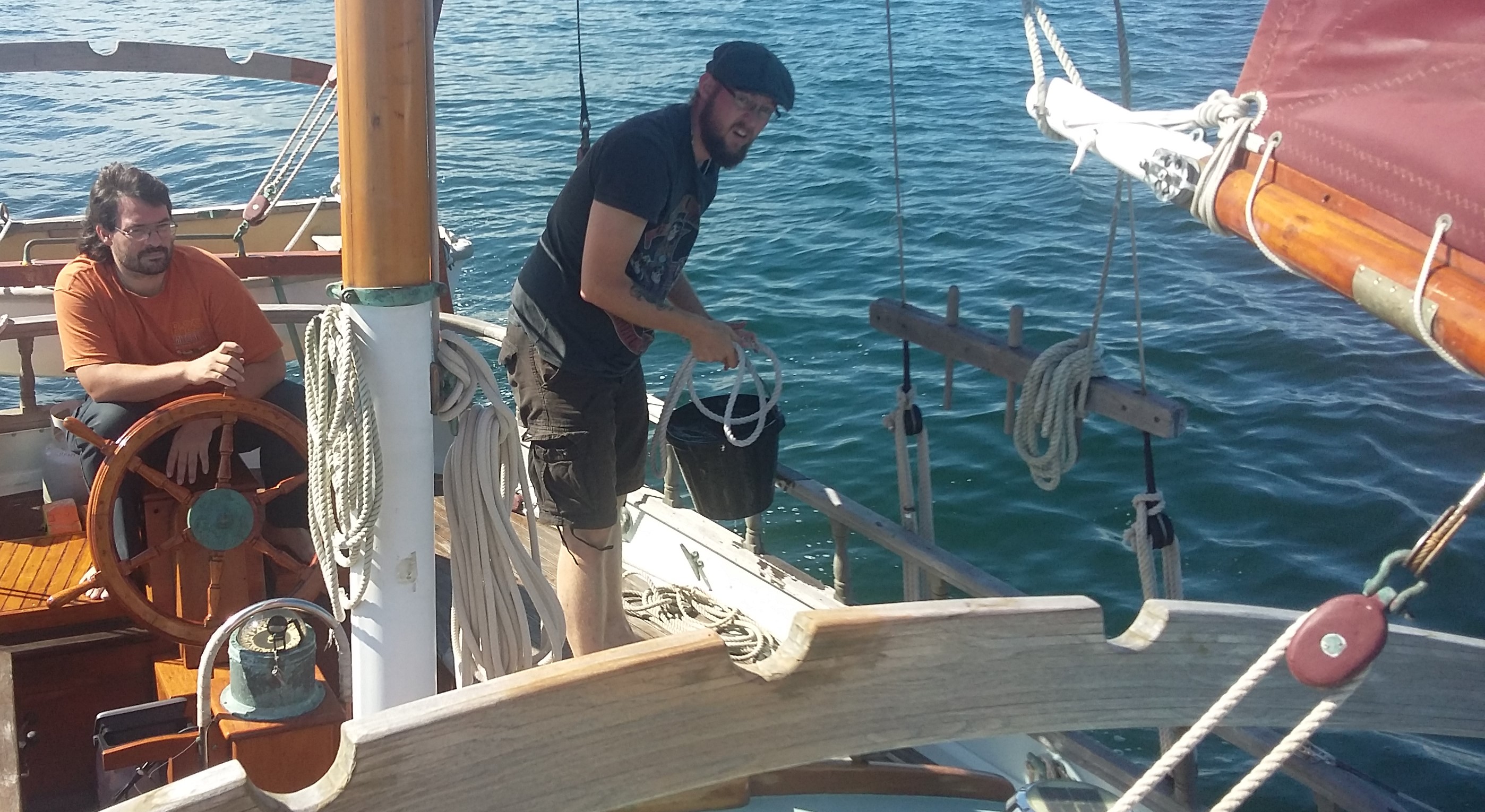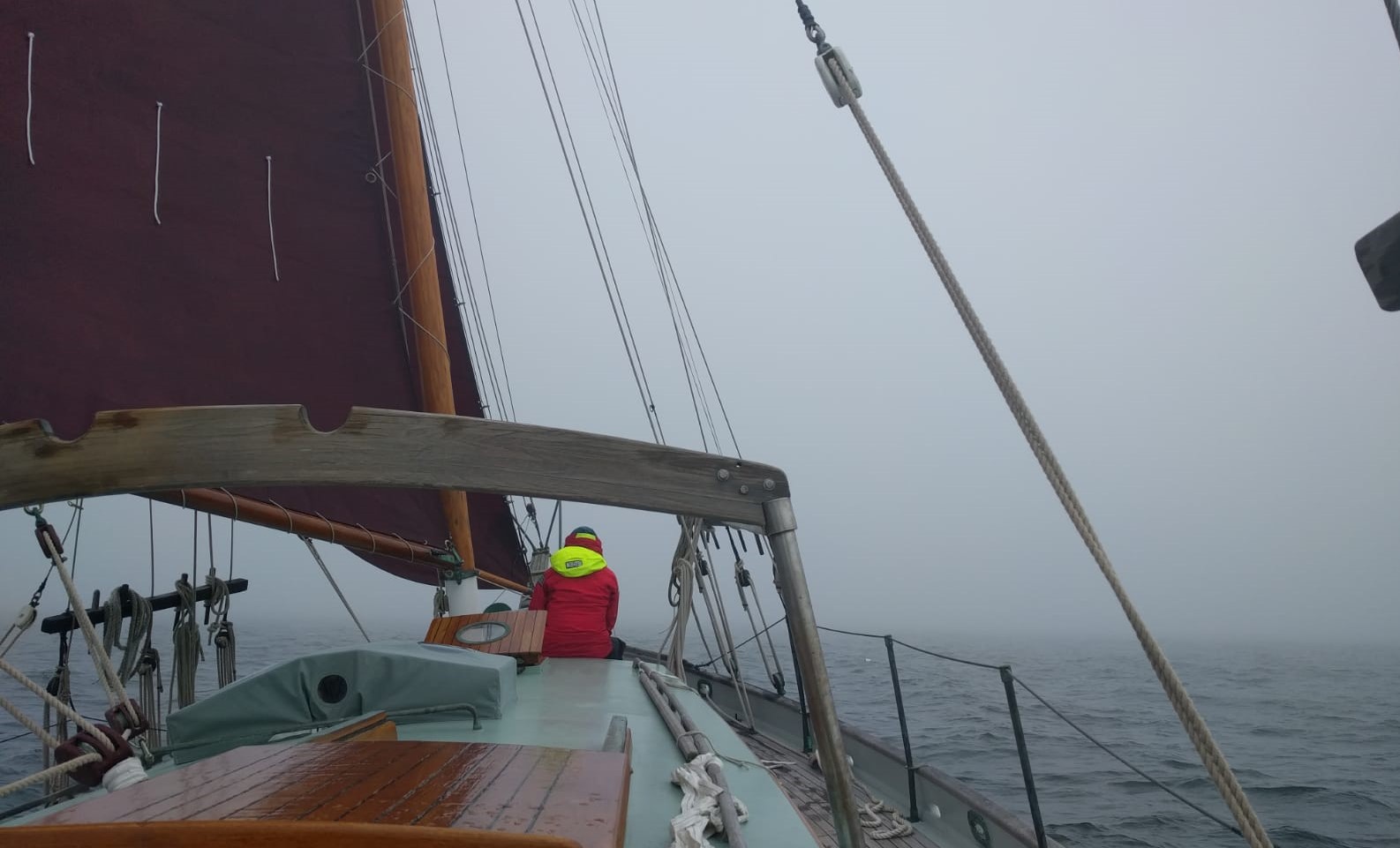 Glücklicherweise stellte sich ein enger Freund von uns zur Verfügung mit uns zu segeln. Dank Pascal konnten wir die erste Überfahrt zu Dritt in Angriff nehmen. Die Vorbereitungen liefen nicht alle nach Plan, weshalb wir leider nicht voll ausgestattet in Rockland ablegten. Wir passierten den Leuchtturm, verliessen das Hafenbecken bei schönstem Wetter und segelten direkt in eine dicke Nebelfront, die über dem Gulf of Main lag. Per GPS und Navtronics brachten wir Sea Chantey auf Kurs ohne weiter als dreissig Meter sehen zu können. In regelmässigen Abständen mussten wir ein Hornsignal geben. Zum Problem wurden uns besonders die Hummerbojen, welche einen ausgebrachten Hummerkorb am Grund signalisieren. Dreimal während der Überfahrt blieben wir mit der rechts vom Kiel angebrachten Schiffsschraube in der Leine einer solchen Boje hängen, weil wir sie zu spät erkannten um auszuweichen. Die ersten beiden lösten wir von der Schraube, bei der dritten sahen wir uns gezwungen die Boje abzuschneiden, was uns mit dem mit einem Messer bewaffneten Bootshaken schliesslich gelang.