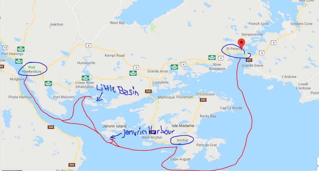 Mit starkem Nordwestwind brachen wir nach Little Basin auf: Selbst unter voller Motorleistung brachte Sea Chantey mit Seitenwind nur 2.5 Knoten. Mitten im Canso Causeway setzten wir den Klüver und liessen uns mit Rückenwind aus dem Kanal ziehen. Allein mit dem Vordersten Segel machten wir 5.5 Knoten, was schon fast Sea Chantey’s Rumpfgeschwindigkeit ist. Dazu hatten wir strahlenden Sonnenschein. Eigentlich hatten wir auch das Besansegel setzten wollen sobald wir den Kurs wechselten, aber unser Ketsch zog so schön, dass wir es bleiben liessen. Little Basin, eine Bucht zwischen einigen Inseln nördlich der Isle Madame erreichten wir in kürzester Zeit. Hinter einer kleinen Insel warfen wir Anker in idyllischer Einsamkeit. Hier konnte ich ungestört die Holzperlen an der Gaffel montieren, womit nun auch das Grosssegel wieder einsatzbereit war. Zu zweit rüsteten wir die Kojen mit Netzen aus, die wir nun diverse Dinge verstauen konnten. Nach dem Abendessen wollte ich eigentlich in Frieden schreiben, aber Reto holte mich an Deck. Die Sterne spiegelten sich im flachen Wasser und es plätscherte, wenn die Fische dicht unter der Wasseroberfläche schwammen. Romantisch, aber mir war es zu frisch, weshalb ich wieder unter Deck ging – nur um kurz darauf wieder an Deck gerufen zu werden. Reto hatte das Deck spülen wollen und dabei Leuchtplankton entdeckt. Wenn der Eimer das Wasser in Bewegung versetzte begann das Plankton als kleine, blaue Fünkchen zu leuchten. Dabei sahen die Funken aus wie Glühwürmchen im Wasser, die auseinanderstoben und einen Moment glitzerten, ehe sie verschwanden. Wir spielten eine Weile mit dem Eimer im Wasser und betrachteten, was aussah wie Spiegelung von blauem Feuerwerk. Wir zogen einen Eimer voll an Bord und ich rührte mit einem Holzlöffel darin auch im Eimer funkelte die Sternschnuppensuppe. Irgendwann trieb uns die Kälte unter die Bettdecke.