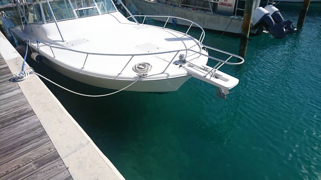 Wer uns kennt weiss, dass Reto normalerweise vor mir aufsteht. Hier im Hafen nutzt er diese Zeit, um einen Ausflug zu den Sanitäranlagen zu machen, womit unser Bord-WC geschont wird. Am Freitag vor dem Pfingstwochenende erregte ein furchtbar tiefliegendes Sportfischerboot seine Aufmerksamkeit. Sein sechster Sinn für leckende Boote brachte ihn ins Hafenbüro, in dem aber noch niemand zugegen war. Ein Security-Mitarbeiter benachrichtigte für ihn den Hafenmeister, während Reto kurzentschlossen zu Sea Chantey zurückkehrte, um die Handpumpe und den Eimer zu holen. Ich lag derweil noch selig träumend in der Koje. «Stefy, da sauft ein Boot ab. Ich gehe es auspumpen», gab er mir Bescheid, aber im Halbschlaf machte ich nur «Mh…hm…» und träumte weiter. Ich erstach in einem unruhigen Traum Ratten in einem Einkaufszentrum mit einem Küchenmesser, als mich der Präsident meines Schützenvereins zu rufen begann. Ich brauchte gute zwei Minuten bis ich feststellte, dass vom Pier aus jemand nach mir rief. Der Gehilfe des Hafenmeisters war von Reto geschickt worden, um Tuck Tape zu holen. Er musste zweimal sagen, was er wollte bis ich begriff, aber gleich darauf grub ich die silberne Tuck Tape Rolle hervor und begleitete den Gehilfen zu Retos Frühsport-Projekt. Das Boot war zirka 12 Meter lang, mindestens vier Meter breit und Reto lag zur Hälfte im Heckstauraum, um mit dem Finger eines der Lecks in einem Schlauch zuzuhalten. Teamwork: Ich rollte ein Stück Tape ab, Reto zog den Finger zurück und ich montierte das Klebeband über dem sprudelnden Loch. Dann bediente ich die Handpumpe, Reto fuhr damit fort die überschwemmte Kabine mit unserem Eimer auszuschöpfen und der Hafengehilfe, der weder Eimer noch Pumpe hatte, stand daneben. Dabei wurde ich endlich wach – Reto verfehlte mit einem Eimer voll Wasser das Hafenbecken und es traf mich eine grosszügige Portion. Bald tauchte der Hafenwart mit einer elektrischen Bilgenpumpe auf, die er an einer Autobatterie anschloss, womit endlich sichergestellt war, dass der Kahn nicht unter unseren Är***en wegsank. Kaum war diese installiert, kam endlich der Angestellte des Bootsbesitzers mit einer dieselbetriebenen Pumpe zur Bewässerung von Gartenanlagen. Damit konnte nun gepumpt werden, weshalb ich Zeit fand selbst das WC aufzusuchen und Wasserfläschchen zu verteilen, die wir nötig hatten. Bald konnten wir den Schauplatz sogar verlassen und das Frühstück zu Mittag essen. Aber wir waren erst halb fertig als wir wieder zum Boot gerufen wurden, weil der Besitzer sich bedanken wollte. «Ich weiss nicht, ob du ein Superheld bist oder sowas, aber ich bin sehr dankbar, dass du das Boot vor dem Absaufen bewahrt hast», sagte der Besitzer und übergab mir einen enormen Beutel voll gefrorener Conch (gesprochen Konk, deutsch Fechterflügelschnecke), von dem Reto wegen seiner Allergie nichts essen darf. Das Boot war derweil fast komplett ausgepumpt. Am Nachmittag brachten wir unsere Conch zum Restaurant des Hafens, dessen Chefkoch mir daraus ein Reisgericht machte und Reto einen Lamm-Hamburger machte.
