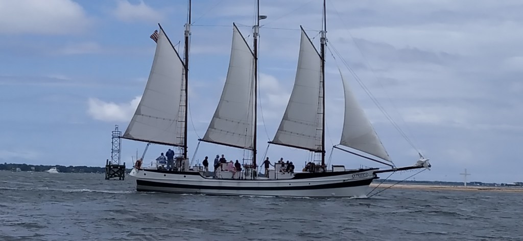 Einen weiteren Tag folgten wir dem Fluss der in einen Kanal führte und von dort in die Lagunen von North Carolina führte. Am Cape Fear River drehten wir nach Süden ab und fuhren wieder in bekanntem Gewässer. Bevor uns die starke Tidenstömung wieder ins Meer hinaus spühlte, drehte uns Reto um und hielt uns im Strom. Wir warteten vor der scharfen Einfahrt bis die Fähre den Hafen wieder verlassen hatte und etwas länger. Im Hafen von Bald Head Island verursacht die starke Fähre einen Wirbelförmigen Strom, der sich erst nach einigen Minuten wieder legt. Danach fuhren wir wie im Januar 2020 an die Tankstelle. Es dauerte nicht lange bis sich Jo, eine der Hafenmeister, an uns erinnerte. Sie hielt geduldig unsere schreiende Gwendolyn bis wir aufgetankt hatten – Gwendolyn gefiel die Prozedur gar nicht. Danach durften wir in einem der Slips parkieren. Jo musste zwar ein wenig herumtelefonieren, aber wie sie herausfand würde das Boot, für welches der Slip am nächsten Tag reserviert war, nicht kommen.