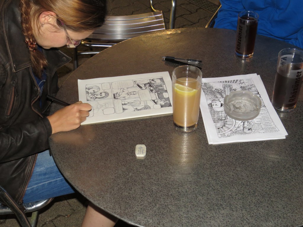 Die Illustrationen entstanden während eines Jahres an den unterschiedlichsten Orten. Hier zum Beispiel spät abends an der Bergparty des Harley Indian Clubs Schweiz, welche jährlich rund um das Restaurant Achenberg stattfindet. Eines der Bilder entstand in den USA. Die letzte Illustration wurde während der Abschiedsparty von Reto und Stefanie fertiggestellt, bevor sich diese auf Weltreise mit ihrem Ketch Sea Chantey begaben. Letzte Abwicklungen mit dem Verlag wurden von Kanada aus gemacht.